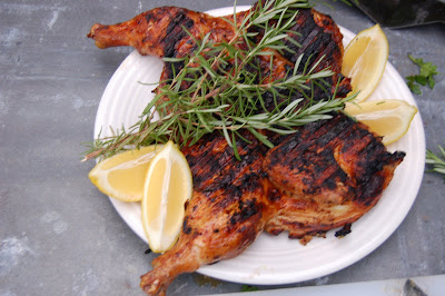 The Italians love to grill over hardwood. In the summertime, they typically cook over an open fire pit just off the kitchen. In the winter, they place a grill in their fireplace. {I have never seen a gas grill in Italy!} . One of the most interesting grilling techniques I have seen in Italy is cooking poultry under a brick. The Italians call this method of cooking under a brick "al mattone". Whether you use an actual brick or not is not important. The idea is to flatten out the chicken so the skin gets a nice crispy texture and the meat cooks fast and stays tender, juicy and moist. It's really easy from start to finish and a great staple for the seasonal summer menu repetoire.